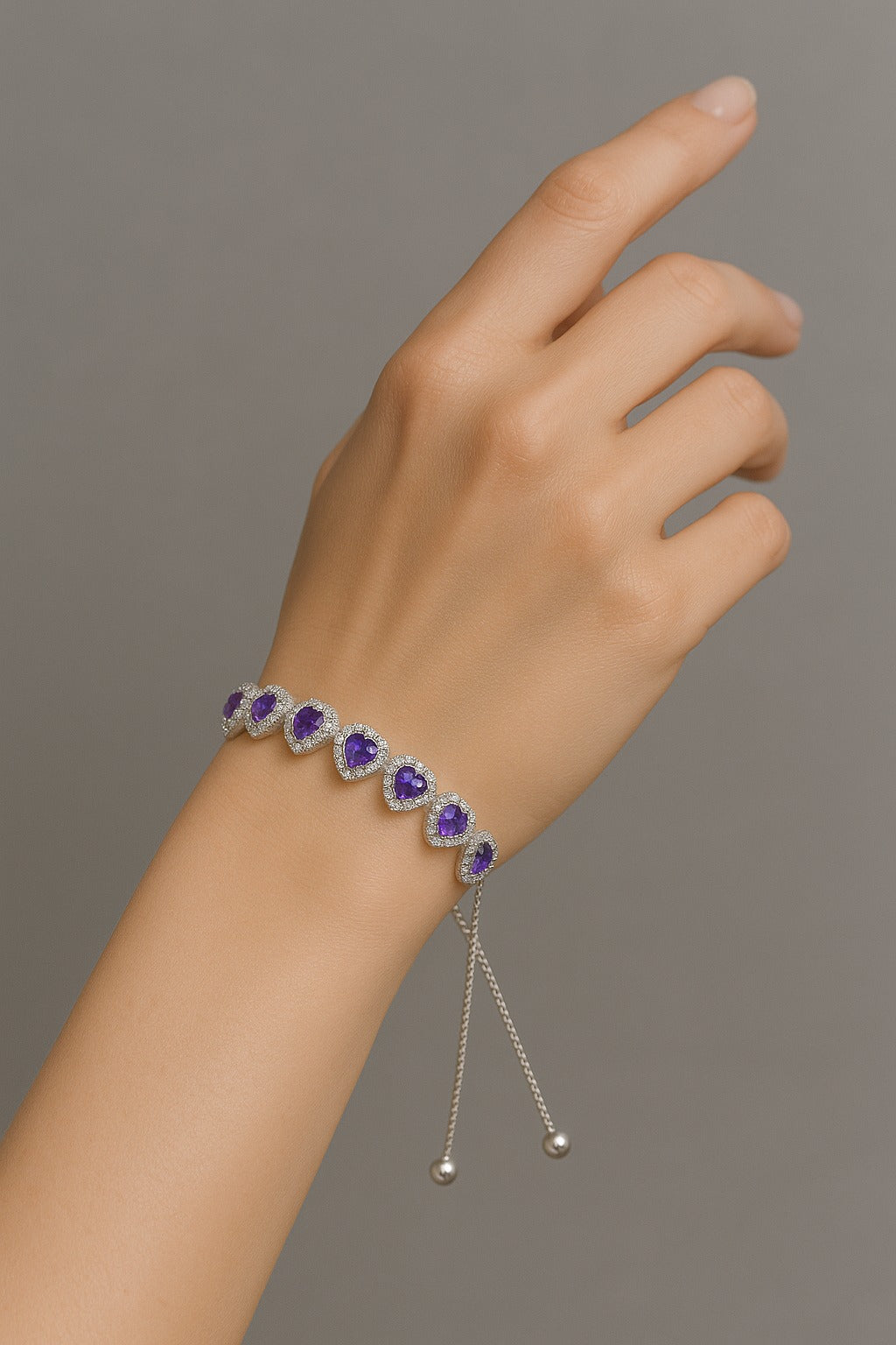 Elevate your elegance with the Royal Amethyst Drop Bracelet, featuring striking teardrop-shaped purple gemstones that exude regal charm. Each gemstone is gracefully set along a polished silver-tone bracelet and accentuated by shimmering American diamonds. The rich amethyst hue offers a perfect balance of sophistication and bold style, making this bracelet an ideal accessory for both festive occasions and refined everyday wear.